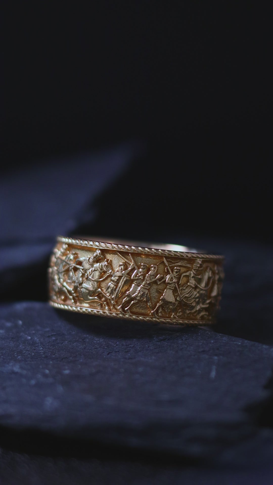 10mm Custom Made, Dome Shaped, Solid Yellow Gold Ring with Medieval Battlefield Depiction