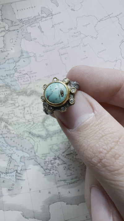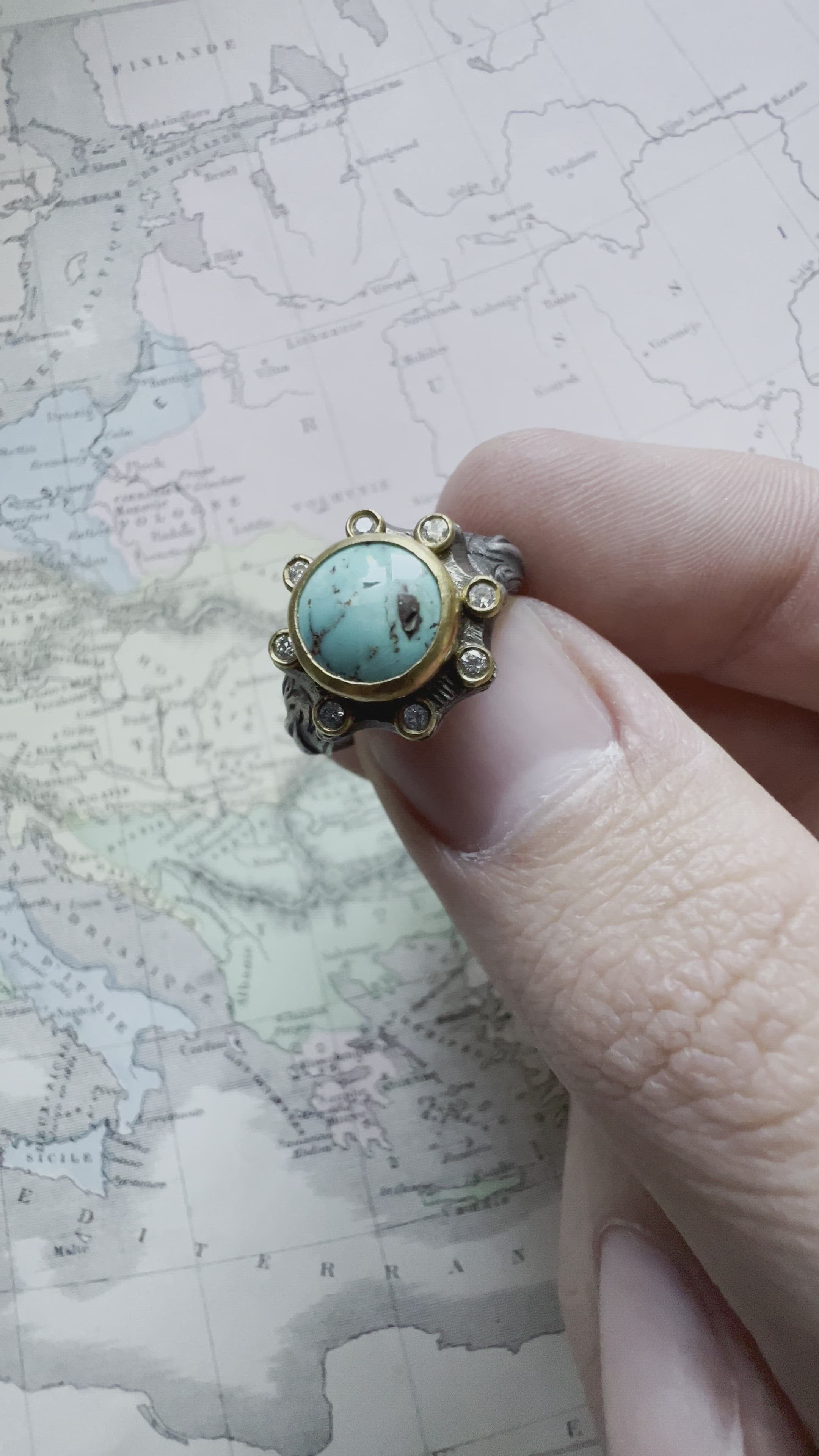 This is a beautiful hand-crafted ring made out of sterling silver. On the centerpiece, there is a beautiful light blue turquoise in a 24k solid gold frame. The turquoise is surrounded by eight diamonds set in 24k solid gold bezels. The ring comes in a US size 5 but can be adjusted down or up a half size.