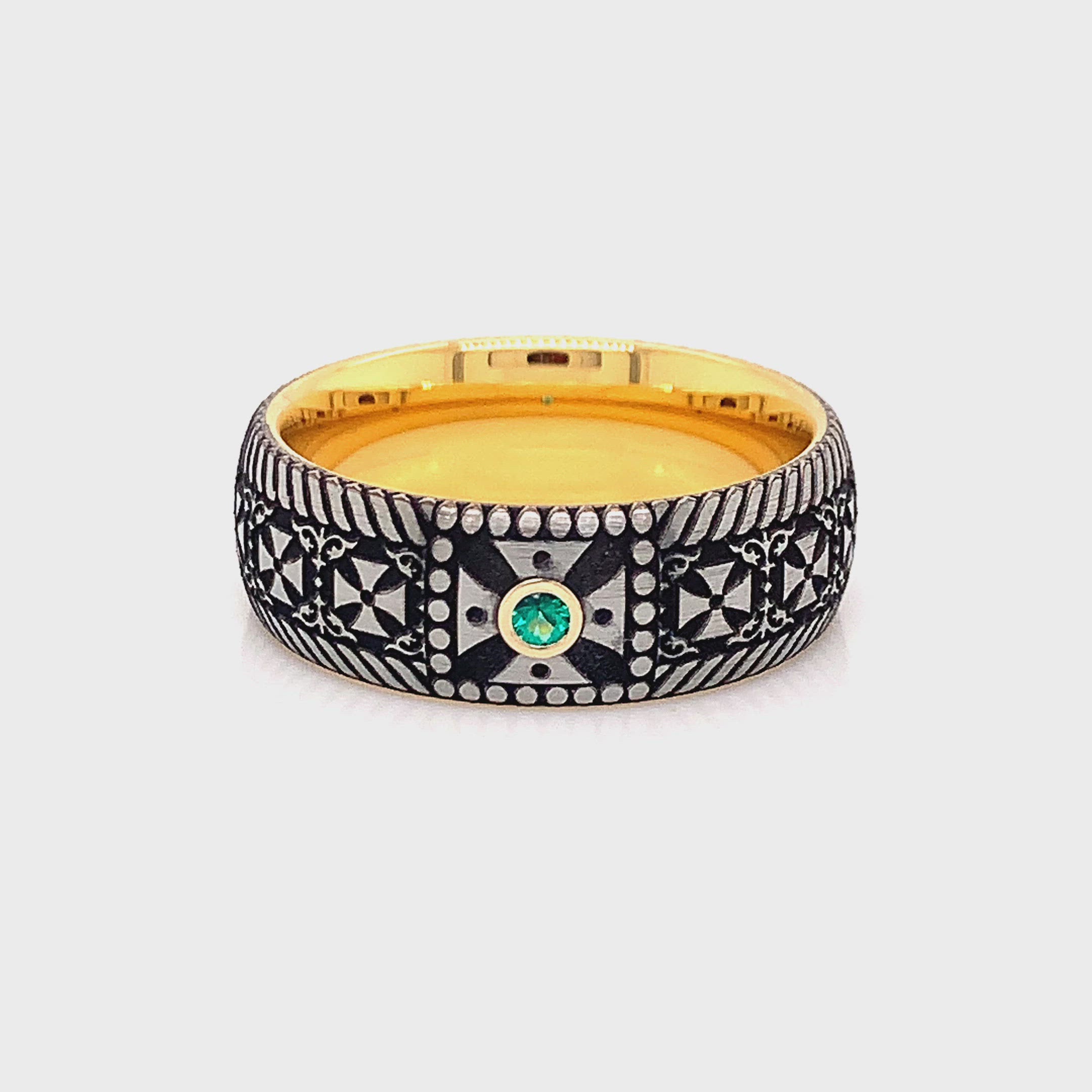 This is a custom made, 8mm, tungsten ring. It is dome in shape, has a brushed exterior, polished yellow gold plated interior. The exterior of the ring features beautiful, detailed engravings of crosses that wrap around the ring. On the edges are a pattern that give the ring depth and dimension. In the center is a bright green round shaped emerald. This style can be worn for many occasions, some of which include: anniversaries, promise rings, birthday gifts, wedding bands...etc.