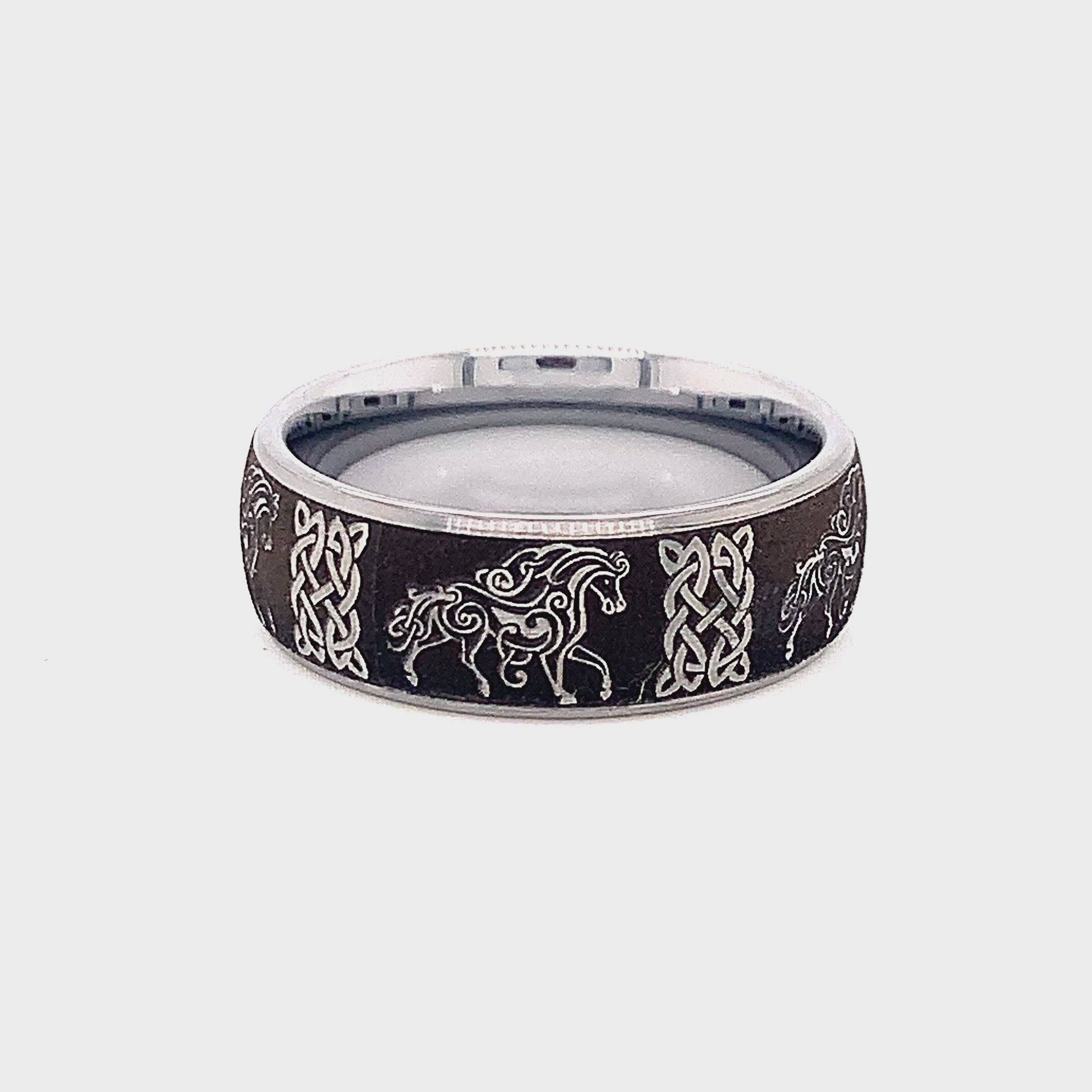 8mm Custom Made Tungsten Ring with Matte Black Plated Exterior Celtic Knot Engraving and Celtic Horses