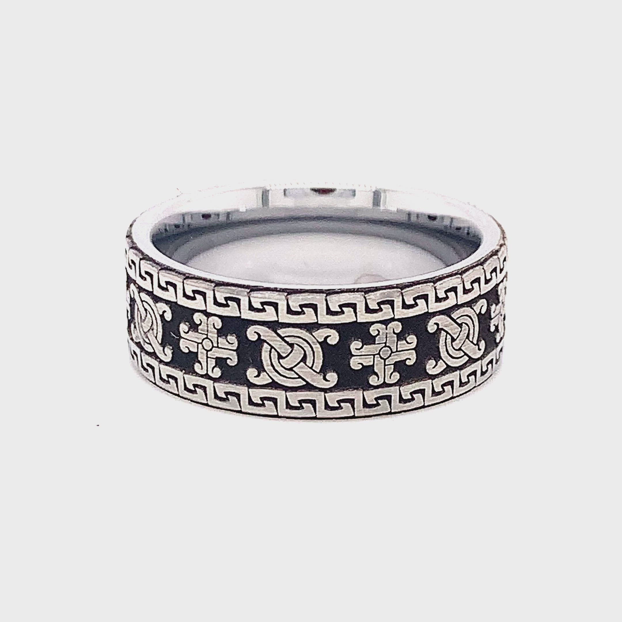 This is a custom made, 8mm, tungsten ring. This ring is flat in shape and has a brushed exterior and polished interior. The exterior features beautiful engraved designs inspired by the Mayan culture. Around the edges are wave like patterns, while the center of the ring has crosses engraved all around. This style can be worn for many occasions, some of which include: anniversaries, promise rings, birthday gifts, wedding bands...etc.