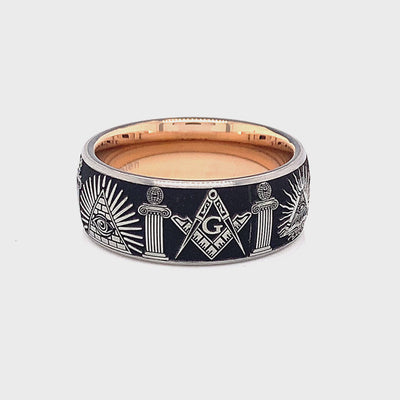 This is a custom made, 9mm, tungsten ring. It has a polished rose gold plated interior and matte exterior. Around the ring you will find detailed Masonic engravings. Each mason symbol has a meaning behind it. This style can be worn for many occasions, some of which include: anniversaries, promise rings, birthday gifts, wedding bands...etc.