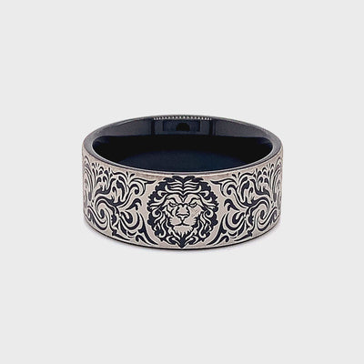 9mm Custom Made Tungsten Ring with Matte Exterior, Polished Black Plated Interior and Lions Head and Victorian Style Engravings
