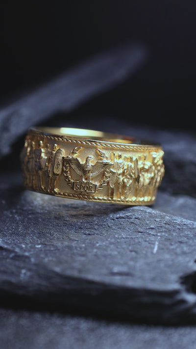 Introducing our exquisite 14k solid gold ring, a masterpiece that brings ancient Roman history to life. This unique piece features a stunning 3D depiction of Emperor Caracalla, inspired by the late 1st-century AD marble relief housed in the Palazzo della Cancelleria. On one end, you’ll find the iconic Capitoline Wolf nurturing Romulus and Remus, while the other end showcases a majestic Roman eagle. Both are adorned with laurel wreaths and the revered SPQR acronym, symbolizing “the Senate and People of Rome.” This ring is not just a piece of jewelry but a timeless tribute to the grandeur of Roman civilization.